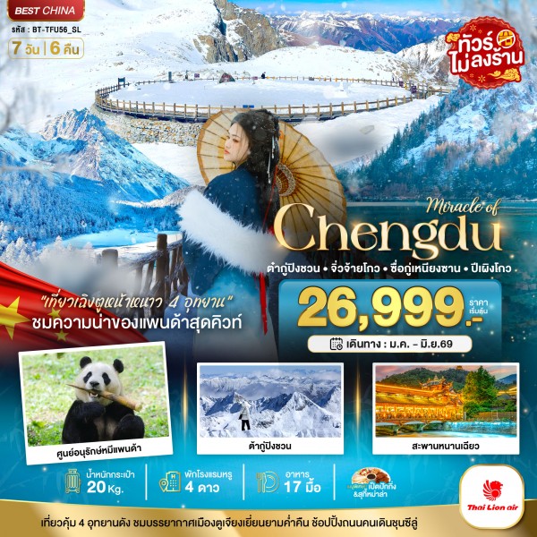เฉินตู ภูเขาสี่ดรุณี ปี้ผิงโกว ต๋ากู่ปิงชวน จิ่วจ้ายโกว 7 วัน 6 คืน สายการบินไลอ้อนแอร์ (SL)